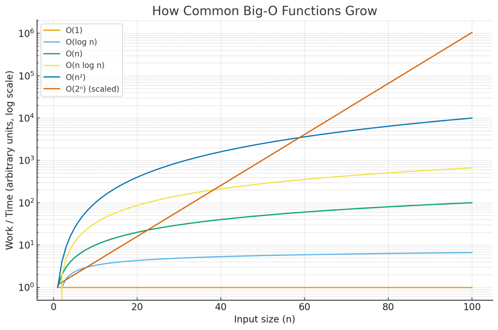- Scalability: Today’s data set fits in RAM; tomorrow’s is 100× bigger. Big-O tells you who survives that jump.